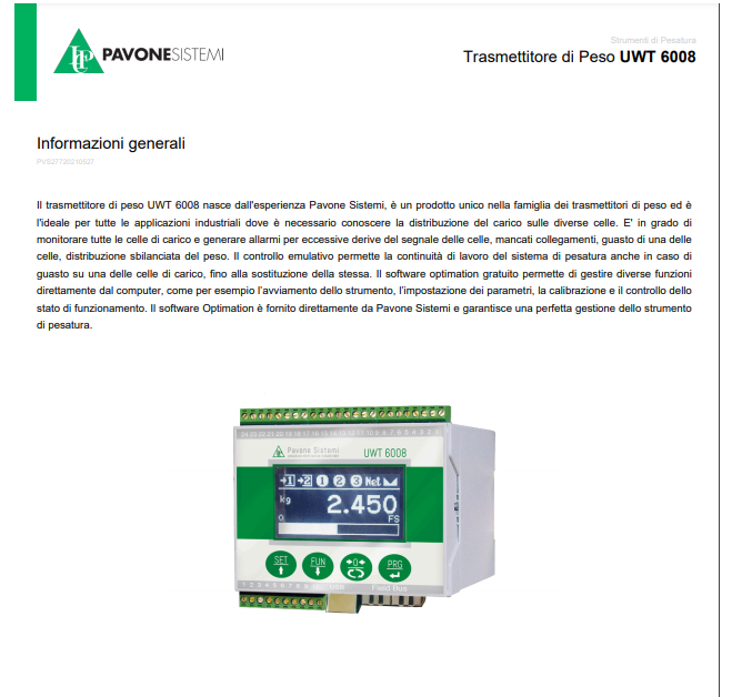 意大利pavone sistemi UWT 6008重量變送器是Pavone Sistemi重量變送器系列中的獨特產品,意大利Pavone Sistemi稱重變送器適合需要了解不同單元上的負載分布的所有工業應用。它能夠監控所有稱重傳感器與意大利帕瓦內壓力傳感器,并在傳感器信號漂移過大、無連接、其中一個傳感器故障、重量分布不平衡時發出警報。即使在其中一個稱重傳感器出現故障的情況下,仿真控制也允許稱重系統的工作連續性,直到它被更換。免費的優化軟件可讓您直接從計算機管理各種功能,如啟動儀器、設置參數、操作狀態的校準和控制。Optimation 軟件由 Pavone Sistemi 直接提供,保證稱量儀器的完美管理。xBS廣州南創電子科技有限公司