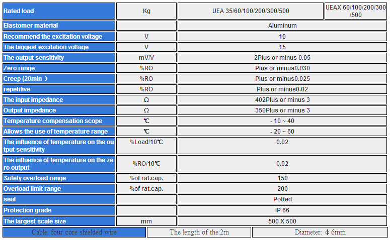 產(chǎn)品描述:臺灣UTE系列傳感器可以滿足各種精度要求,UEA和UEAX型傳感器的稱量從35Kg至500Kg,鋁合金結(jié)構(gòu),密封緊密。可適用于多種的稱重設(shè)備。出廠時已通過四角調(diào)整保證其在規(guī)定的受載平面內(nèi)個點輸出一致;可用于制作傳感器構(gòu)成的各種形式電子臺秤,小地磅,產(chǎn)品結(jié)構(gòu)形式簡單、使用方便。