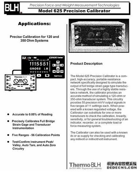 傳感器事業(yè)部)里面的一個。除了應變計比以前的Vishay BLH產(chǎn)品全部品牌的Vishay BLH品牌。日前,Vishay BLH以前的品牌為應變計產(chǎn)品,美國BLH 625 Calibrator稱重顯示儀表如SR-4®應變計,現(xiàn)在由威世測量集團在國內(nèi)建立了和作伙伴(廣州南創(chuàng)電子科技有限公司)日前,Vishay微測量分部(微測量師)品牌的擁有。