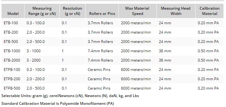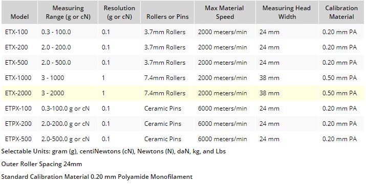 Checkline ETX / ETPX數據記錄張力儀專為在各種應用中精確測量細金屬絲,紗線和纖維上的張力而設計。滾子或陶瓷銷釘安裝在長的“指狀物”的末端,使用戶可以在有限的進入空間內或在幾條線緊緊排列時(例如在經紗板上)測量張力。提供五(5)個測量范圍,最大容量為2000克或cN。1000 g和2000 g型號分別在短銷(手指)上安裝了直徑7.4mm的V型槽滾輪,而不是標準長度的銷(手指)和3.7 mm微型滾輪。