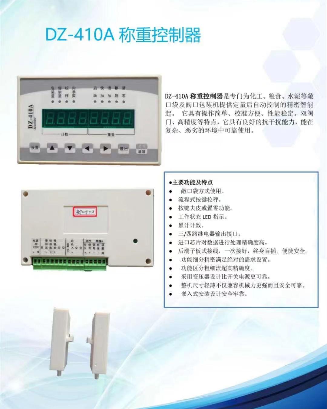 dWm廣州南創(chuàng)電子科技有限公司DZ-410A稱重控制器介紹:dWm廣州南創(chuàng)電子科技有限公司DZ-410A稱重控制器是專門為化工、糧食、水泥等敞口袋及閥口包裝機(jī)提供定量后自動(dòng)控制的精密智能起。 它具有操作簡(jiǎn)單、校準(zhǔn)方便、性能穩(wěn)定。雙閥門、高精度等特點(diǎn),它具有良好的抗干擾能力,能在復(fù)雜、惡劣的環(huán)境中可靠使用。