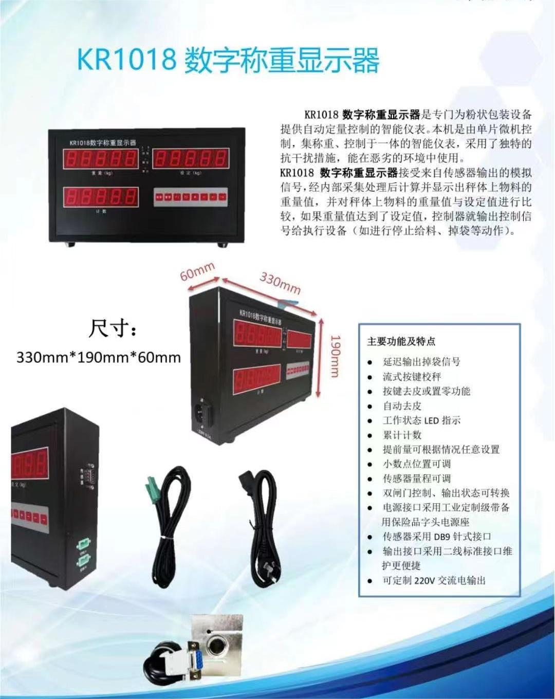 d7x廣州南創電子科技有限公司KR1018 數字稱重顯示器接受來自傳感器輸出的模擬信號,經內部采集處理后計算并顯示出秤體上物料的重量值,并對秤體上物料的重量值與設定值進行比較,如果重量值達到了設定值,控制器就輸出控制信號給執行設備(如進行停止給料、掉袋等動作)。