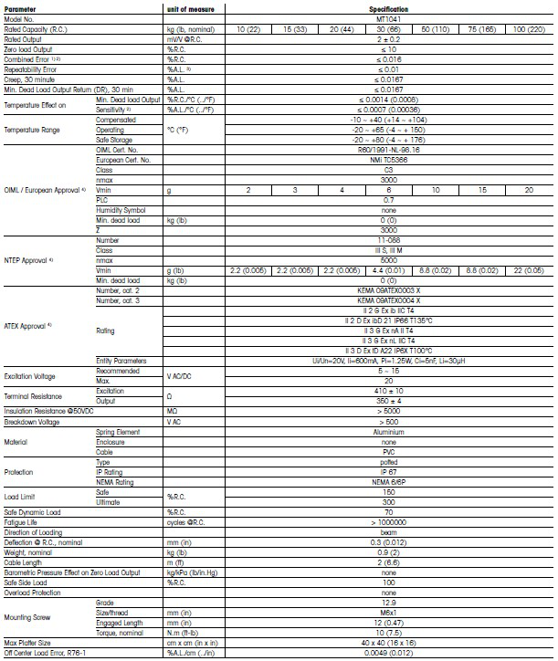梅特勒托利多MT1041-75稱重傳感器技術指標: