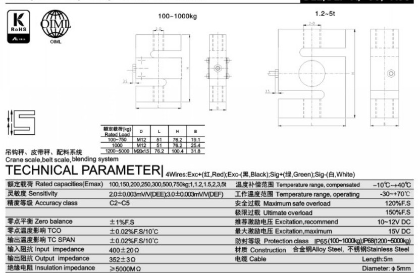 靈敏度:2.0 ± 0.02 mV / V的( 20KG - 7.5T )1.8 ±0.02 mV / V的(10T )