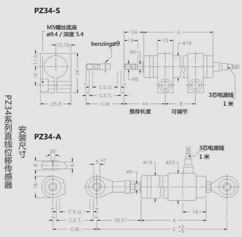 iIb廣州南創電子科技有限公司杰佛倫gefran電子尺PZ-34-A-150 PZ-34-S-050尺寸圖:iIb廣州南創電子科技有限公司