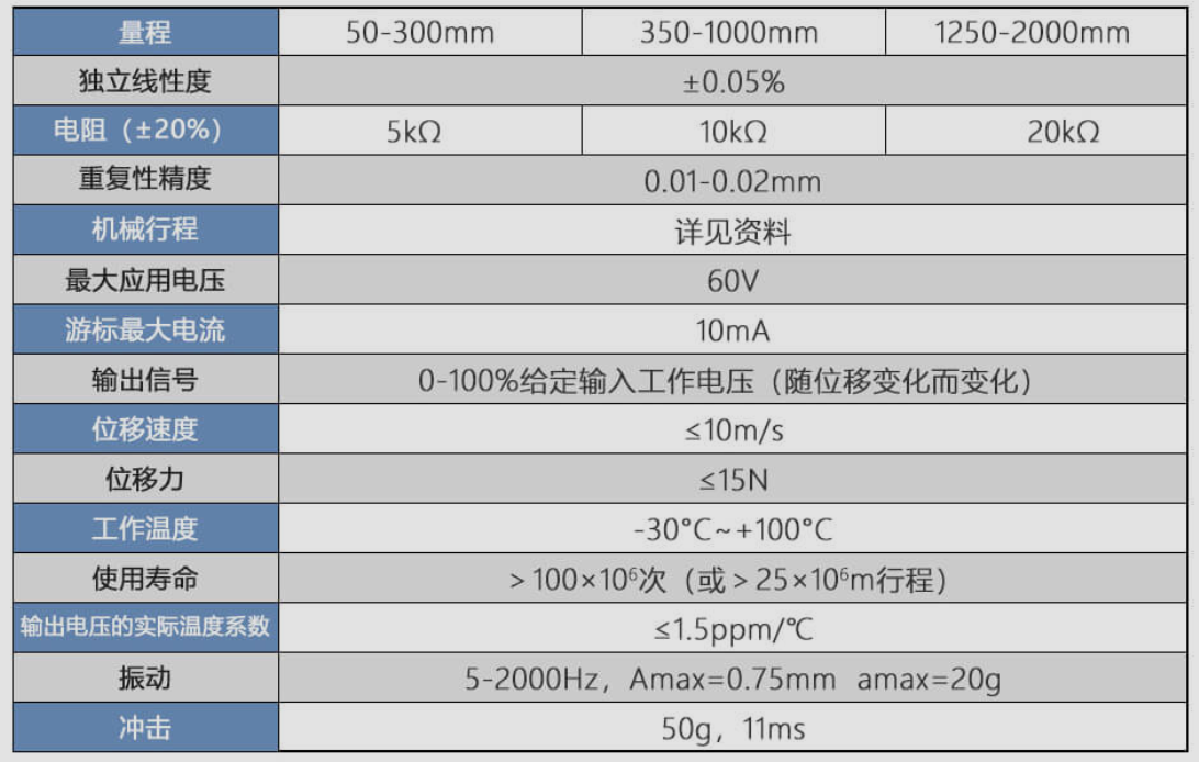 gOD廣州南創電子科技有限公司杰佛倫圓柱型位移傳感器PC-M-0100 PC-M-0130相關特點: gOD廣州南創電子科技有限公司PC直線位移傳感器(別名:電子尺,電阻尺,電位器,位移傳感器)原理:電位計原理,使用 2 個球節的機械固定和自對準連桿,最大角運動達 ± 30°,獨立線性度 ± 0.05%,可重復性 0.01 毫米,無限分辨率。超出理論電氣行程后無電氣信號輸出變化安裝更簡單。輸出直流電壓信號,也可以通過內置或者外置的變送模塊講信號轉換成標準的0-5V、0-10V或者4-20mA直流信號,也可以遠距離傳輸控制要求。適用于各種高機械強度場合的位移測量。