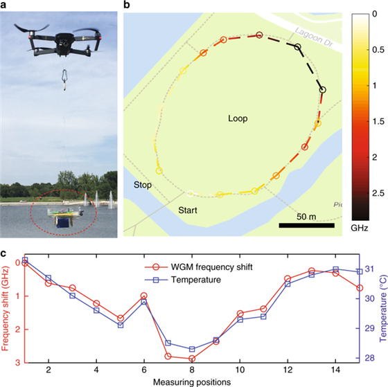 當(dāng)無人機(jī)從一個測量位置飛到另一個測量位置時,WGM傳感器的共振頻率由于溫度變化而發(fā)生變化,共振頻率的變化如圖4b所示 ,其中可以清楚地看到溫度變化的梯度,測量結(jié)果與商用溫度計的結(jié)果匹配良好(圖 4c)。在補(bǔ)充材料中我們提供了視頻演示,其中攜帶整個系統(tǒng)的無人機(jī)從具有較高溫度(在陽光下)的一個位置飛行到具有較低溫度(在陰影中)的另一個位置,使用定制的移動應(yīng)用程序可以清楚地觀察到共振頻率的偏移。