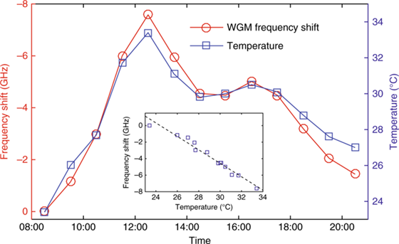 通過12小時的測量,我們獲得了所選諧振模式的頻移圖(如圖3所示) ,封裝WGM傳感器的共振頻率偏移與商用溫度計的結(jié)果匹配良好,并且與溫度變化具有線性關(guān)系(圖 3插圖)。兩條曲線的小偏差主要來自激光頻率的不穩(wěn)定性,通過優(yōu)化激光電流驅(qū)動器和TEC控制器的電路設(shè)計可以將偏差最小化。