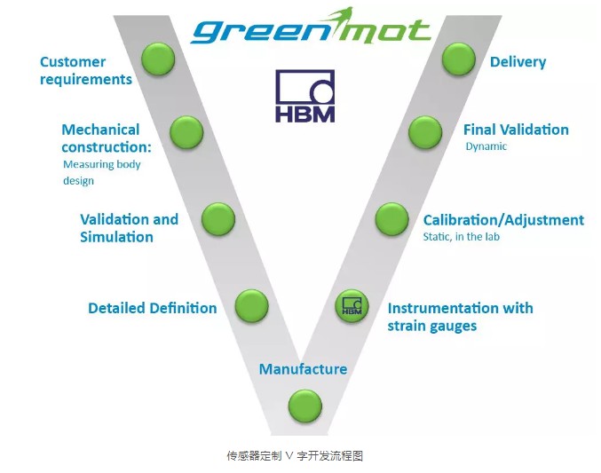 在定義這些傳感器時,GrimoMT 借鑒了其在測試臺設計中的機械工程能力。其基于待測試車輛的CAD模型。實際傳感器包括帶有應變片的傳感器測量體和用于傳輸測量值的發送器。這些扭矩傳感器的開發方法遵循經典的V模型,所有的項目定義都在V字的下行線上,制造和驗證步驟在V字的上行線上。開發過程可能需要18到20周。通過 HBM 專門設計的應變片和專利,并進行溫度和結構補償,這些傳感器的實驗室的精度超過了 0.1%,在真實環境中的精度可達 0.2%,測量頻率為1 kHz。