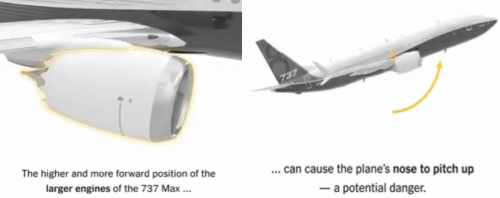 他指出,波音737Max為了省油,升級(jí)了更大的新發(fā)動(dòng)機(jī),但由于起落架太短,只能把發(fā)動(dòng)機(jī)在機(jī)翼的位置往前、往上移,但這會(huì)造成更大的抬頭力矩而使得飛機(jī)容易失速。