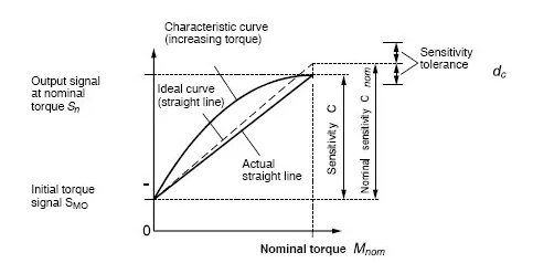 靈敏度C被表示為特性曲線的斜率。特性曲線為連接未加載的扭矩傳感器的輸出信號SM0和額定扭矩輸出信號Sn之間的直線。簡單表達式為