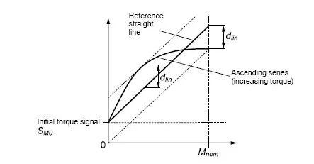 為了確定線性誤差,負載需要從零增加到額定扭矩并進行了一系列測量。基準直線是穿過初始點的最佳擬合直線。規定的線性偏差是實際輸出信號與參考直線的最大偏差。也可以描述為公差帶(偏離直線的上下偏差量之和)寬度的一半,該寬度與基準直線對稱。