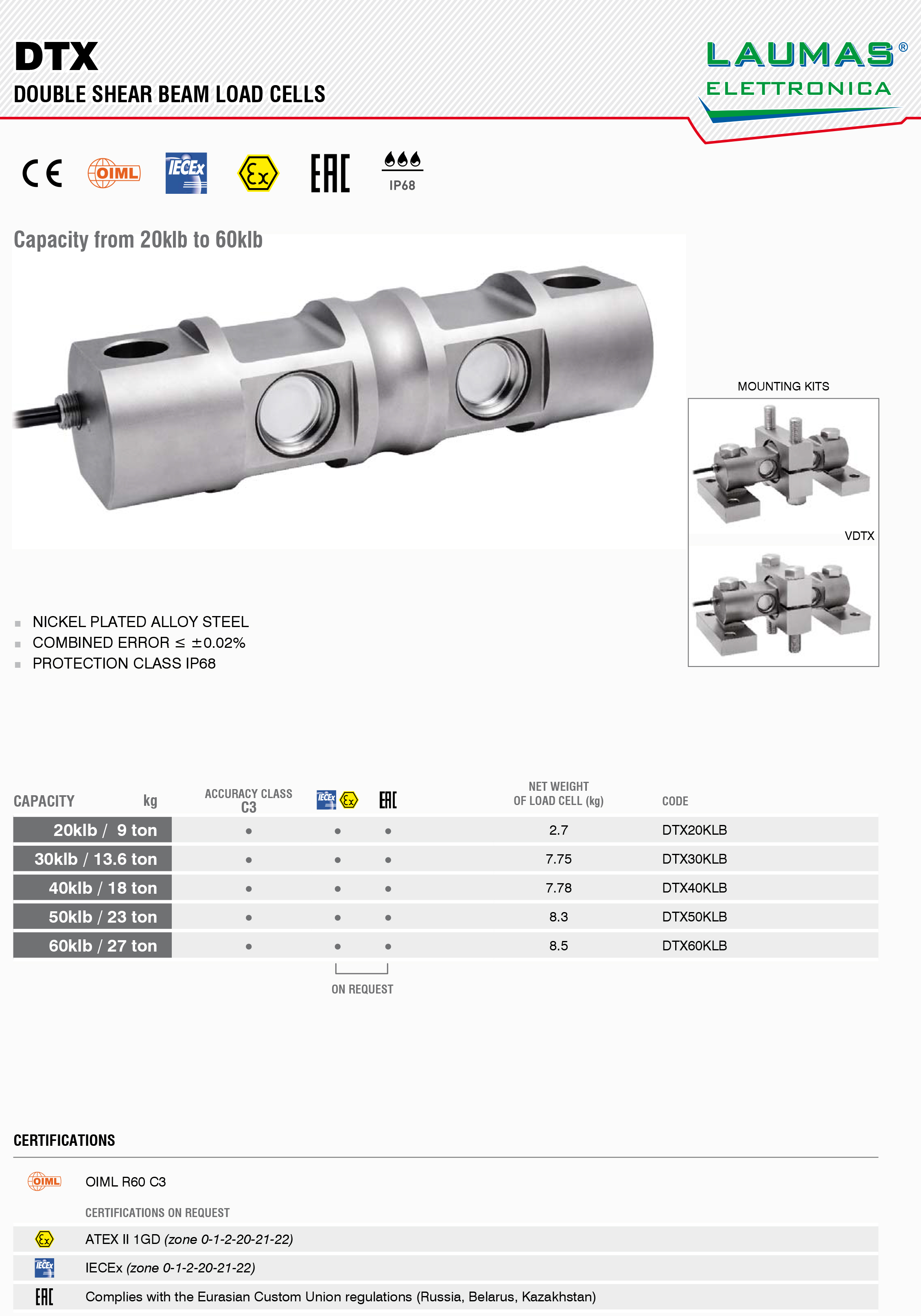 產品名稱:DTX雙剪梁稱重傳感器_DTX-20Kg,DTX-50Kg意大利Laumas