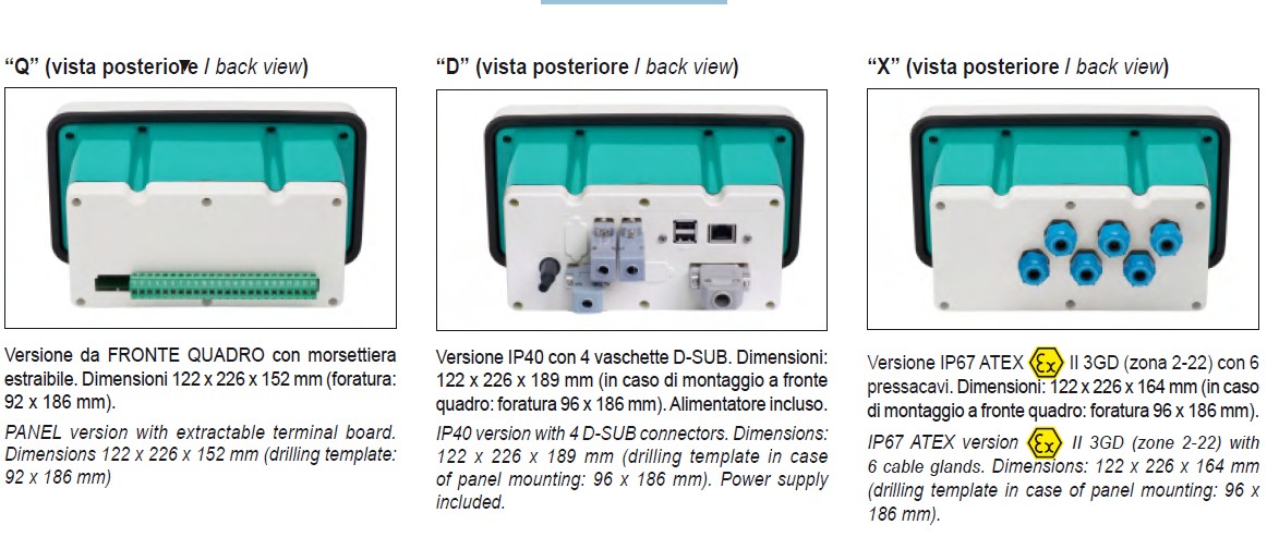 Different versions for various types of electrical connections: cable glands, D-SUB connectors, removable terminal.Possible installations: wall, panel, column, desk
