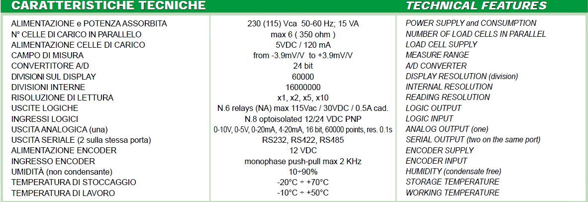 Possibilità di visualizzare durante il funzionamento lo stato degli I/O, il peso corrente, la velocità istantanea, gli impulsi encoder e il fattore di correzione impostato.