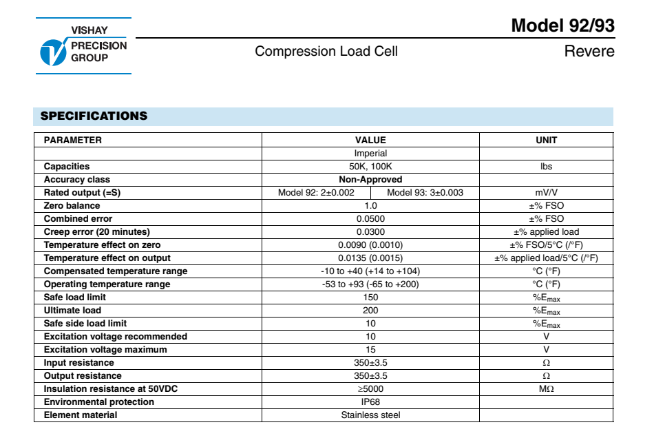vishay Revere 93-50klbs稱重傳感器型號類別技術參數選型安裝等資料信息,如果有關