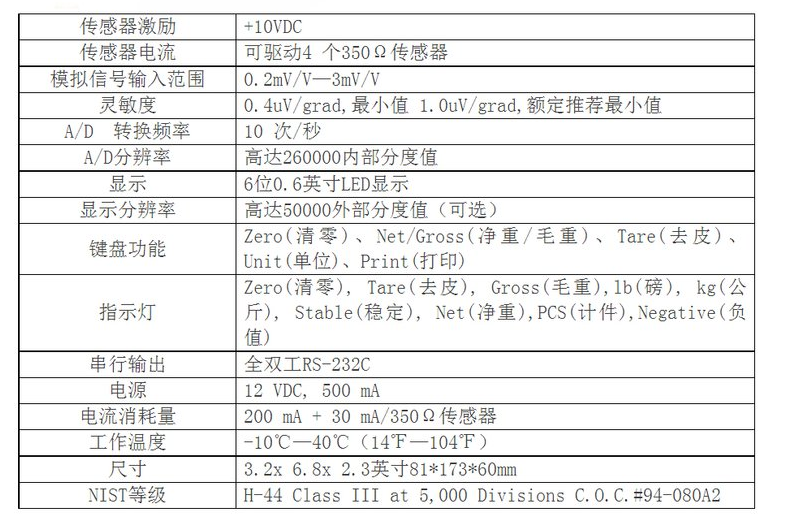 BSH稱重模塊Qnr廣州南創(chuàng)電子科技有限公司SBST稱重模塊Qnr廣州南創(chuàng)電子科技有限公司Qnr廣州南創(chuàng)電子科技有限公司美國傳力TI-500E稱重顯示儀表相關知識拓展閱讀:Qnr廣州南創(chuàng)電子科技有限公司美國傳力稱重顯示儀表TI-500E的技術參數(shù)具體介紹:TI-500E稱重儀表Transcell傳感器激勵:+10VDC傳感器電流:可驅(qū)動4個350Q傳感器模擬信號輸入0圍:0.2mV/V---3mV/V靈敏度:0.4uV/grad,最小值1.0uV/grad,額定推薦最小值A/D轉換頻率:10次/秒A/D分辨率:高達260000內(nèi)部分度值顯示:6位0.6英寸LED顯示顯示分辨率:高達50000外部分度值(可選)鍵盤功能:Zero(清零)、Net/Gross(凈重/毛重)、TI-500E儀表Tare(去皮)、Unit(單位)、Print(打印)指示燈:Zero(清零),Tare(去皮),Gross(毛重),Ib(磅),kg(公斤),Stable(穩(wěn)定),Net(凈重),PCS(計件),Negative(負值)串行輸出:全雙工RS-232C電源:12VDC,500mA電流消耗量:200mA+30mA/350Q美國傳力稱重顯示儀表TI-500E傳感器工作溫度:-10℃---40℃(14°F---104F)尺寸:3.2"×6.8”×2.3”NIST等級:H-44 Class III at 5,000Divisions C.O.C.#94-080A2保修:1年保修。