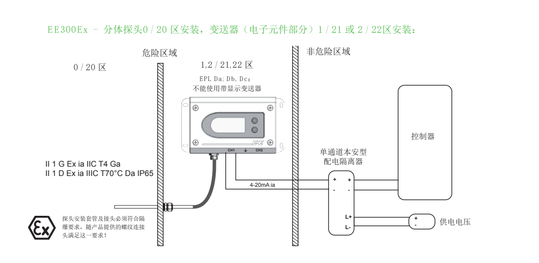 ee300EX溫濕度顯示器探頭均可安裝在易燃易爆危險區域其電氣連接采用標準兩線制信號,可以通過雙通道本安型配電隔離器或齊納安全柵為變送器供電,測量信號通過兩路4~20mA的模擬通道輸出。除了輸出相對濕度和溫度信號。測重全氣中的度,3x也能用測分,可以m相[aw]輸出。典型應用包括:海上石油鉆井平臺的油品劣化測量,以及變壓器油、潤滑油、液壓油的在線監測。