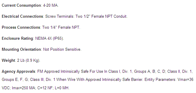 608系列微差壓變送器用于空氣或其它兼容氣體的壓力,差壓,負(fù)壓的測(cè)量,輸出標(biāo)準(zhǔn)的兩線制4-20 MA信號(hào)。它采用了超薄的硅膠隔膜,可測(cè)量低到0.1英寸水柱的量程范圍,并且同時(shí)可承受高靜壓到100 Psig (6.89 Bar)。608變送器帶有FM認(rèn)證的本安防爆證書,配合本安隔離柵可用于危險(xiǎn)場(chǎng)合。它的不銹鋼的NEMA 4X防護(hù)的外殼最適合用于各種工業(yè)場(chǎng)合。FYi廣州南創(chuàng)電子科技有限公司